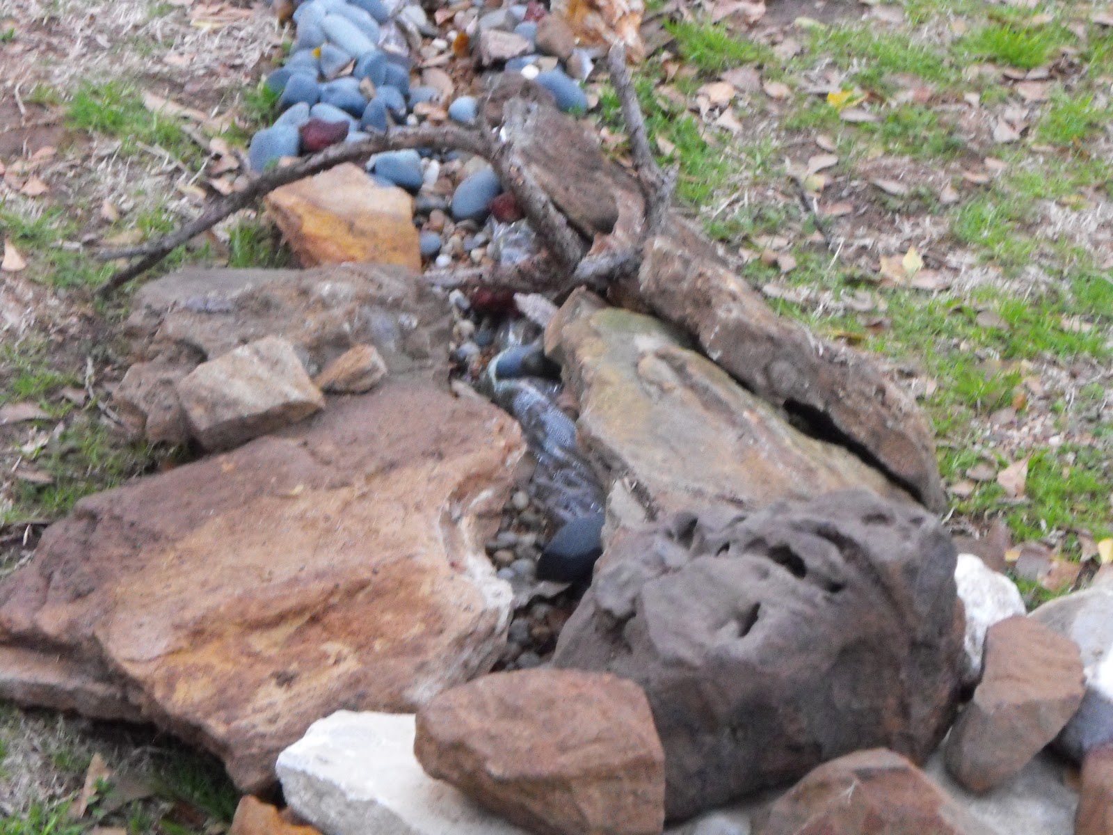 Added some rocks, and an interesting twisted dead branch I rounded up to the water source of the pilot creek.