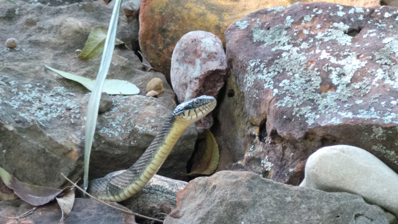 I was sitting on our rocker swing and started to think that if you sat quiet enough you would see some kind of critter come a long. Well low and behold this was in our rocks that go along our pond and water fall. This looks a lot like a Rat snake.
